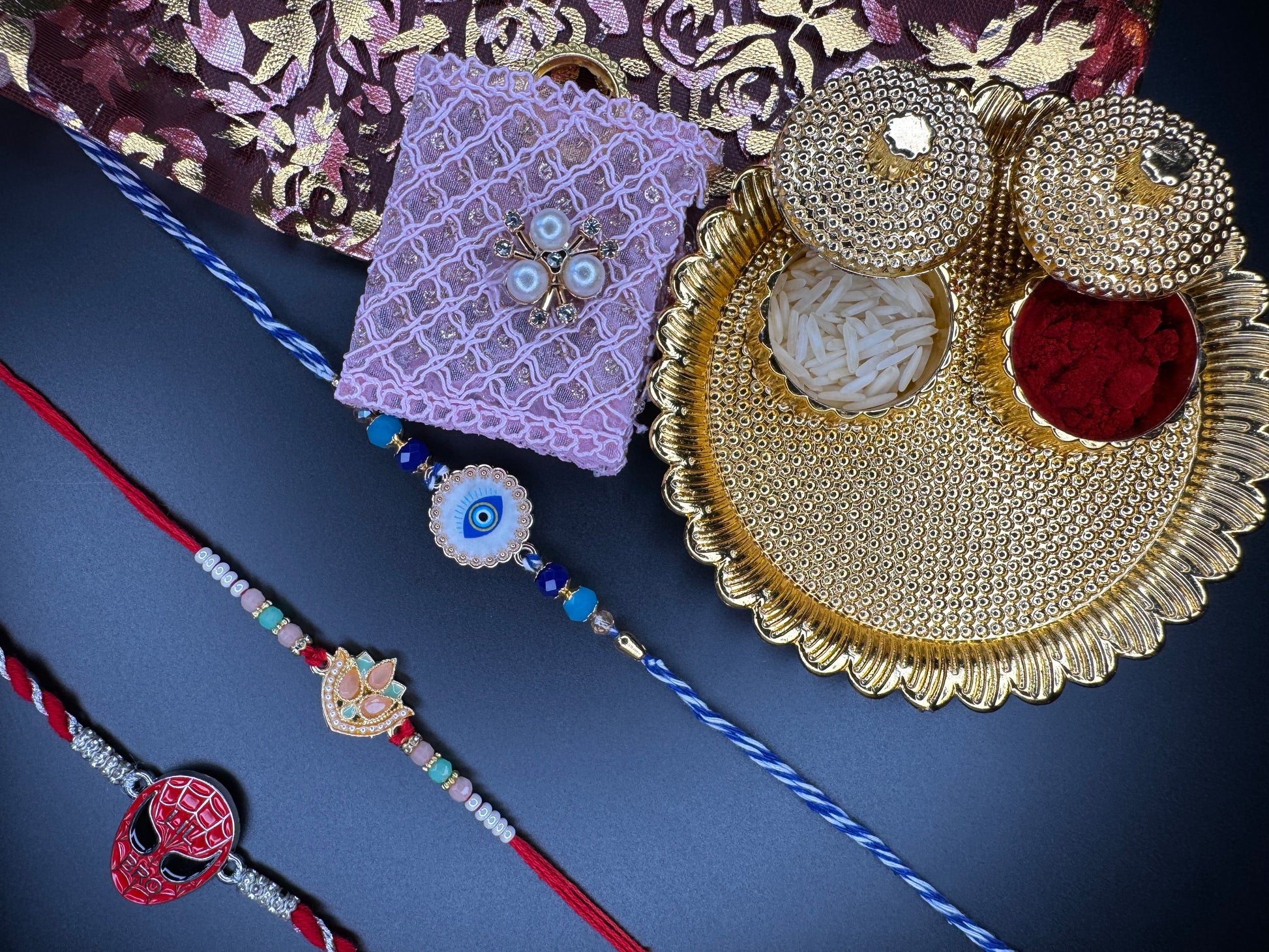 Mini Rakhi Celebration Combo – 3 Rakhis with Pooja Thali & Tikka Bag