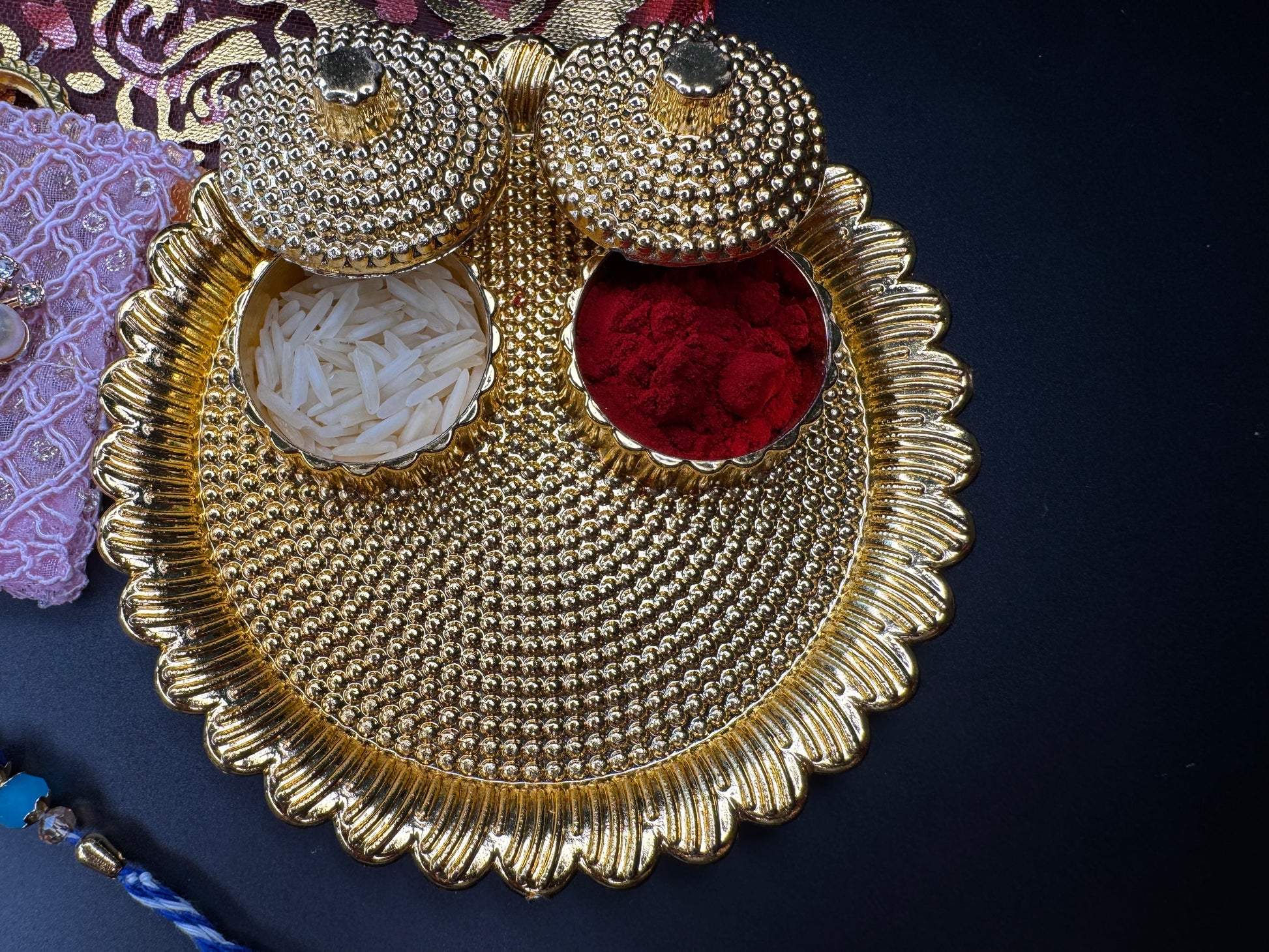 1 Small Gold Embossed Pooja Thali with chawal & roli containers
