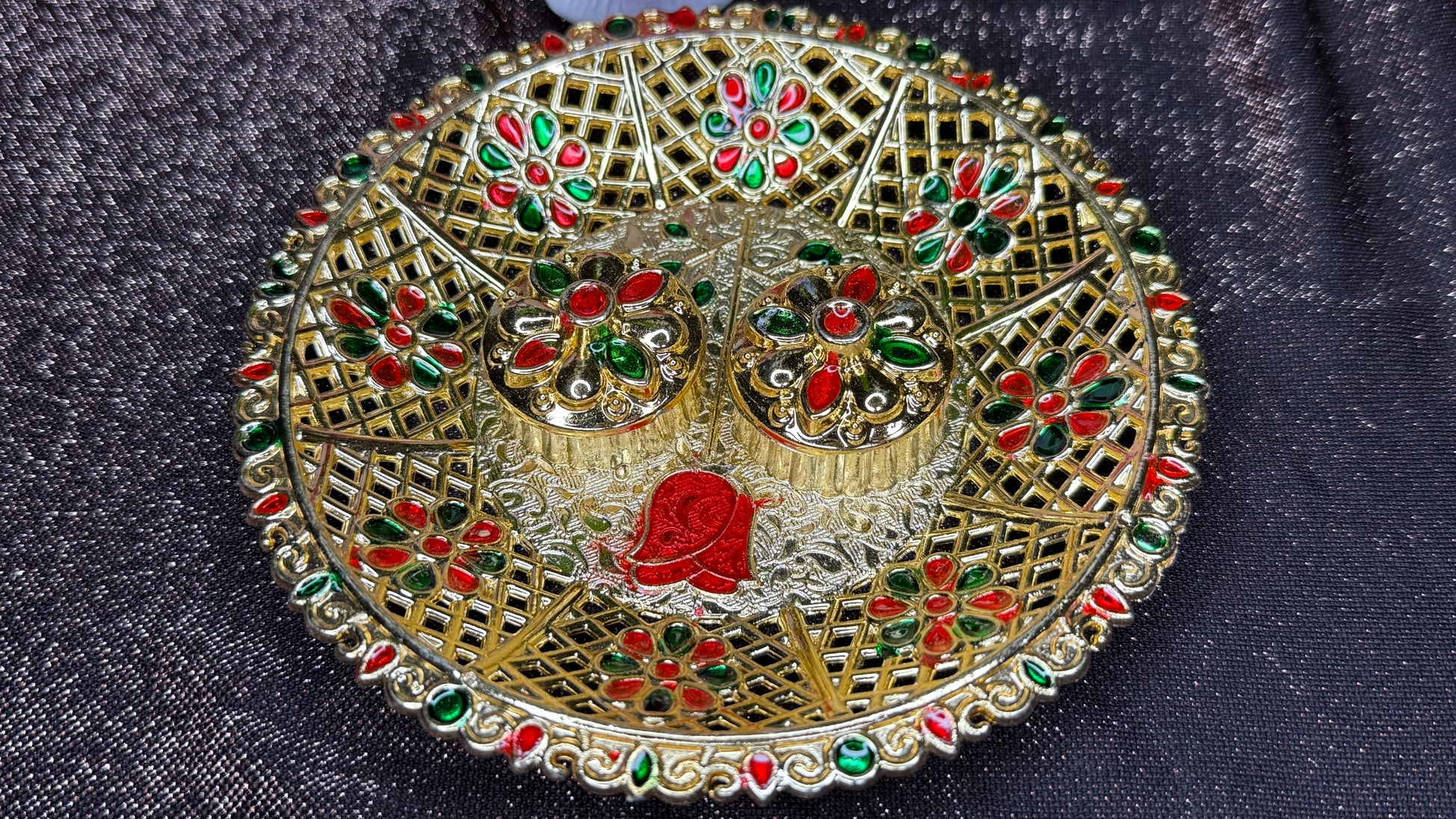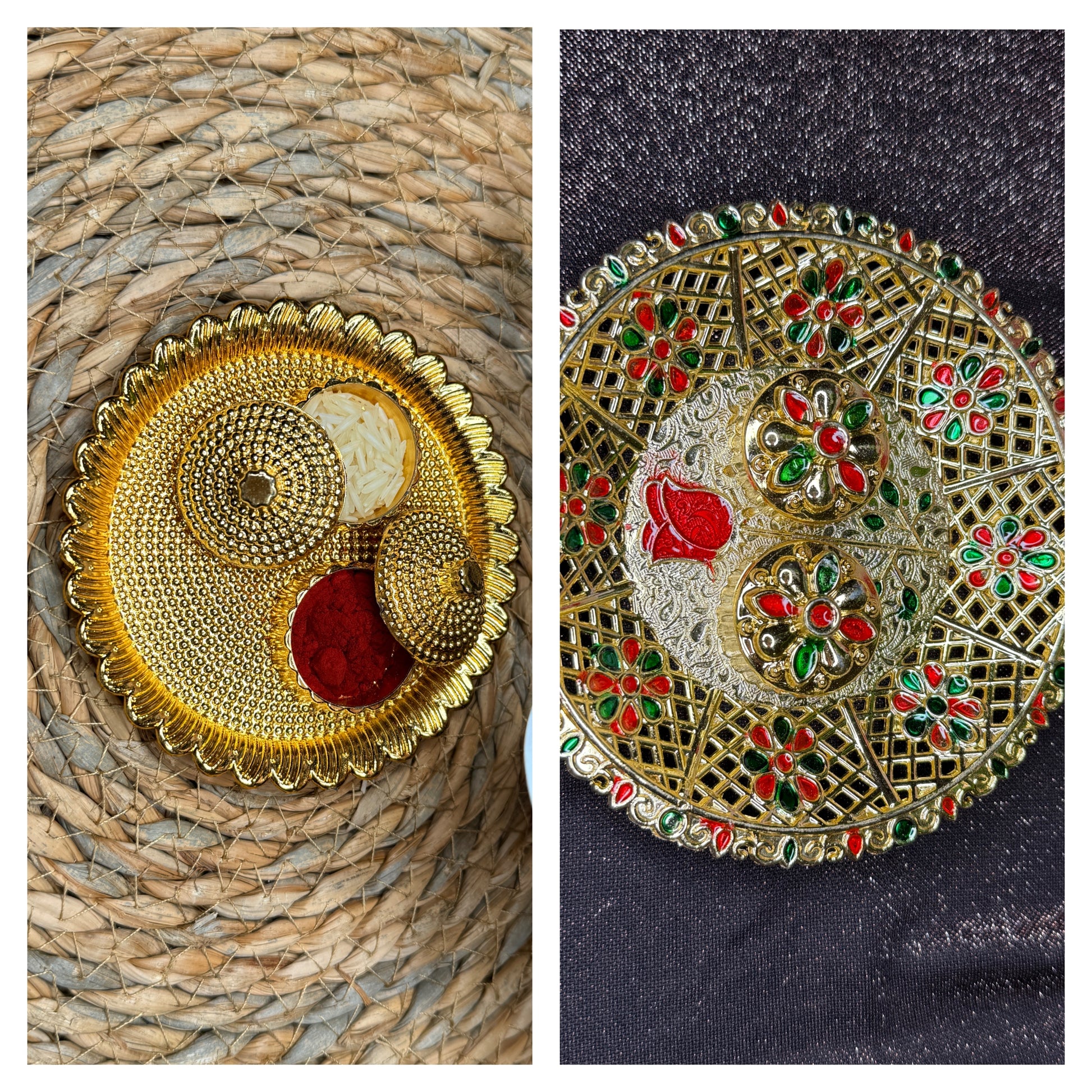 Enhance your spiritual rituals with this beautifully crafted Pooja Thali, specially designed for daily pooja, special ceremonies, and festive occasions like Diwali, Navratri, Raksha Bandhan, and more. Made with high-quality materials, this thali includes essential compartments for diya, roli, rice, incense holder, and more – everything you need for a complete and sacred pooja setup.