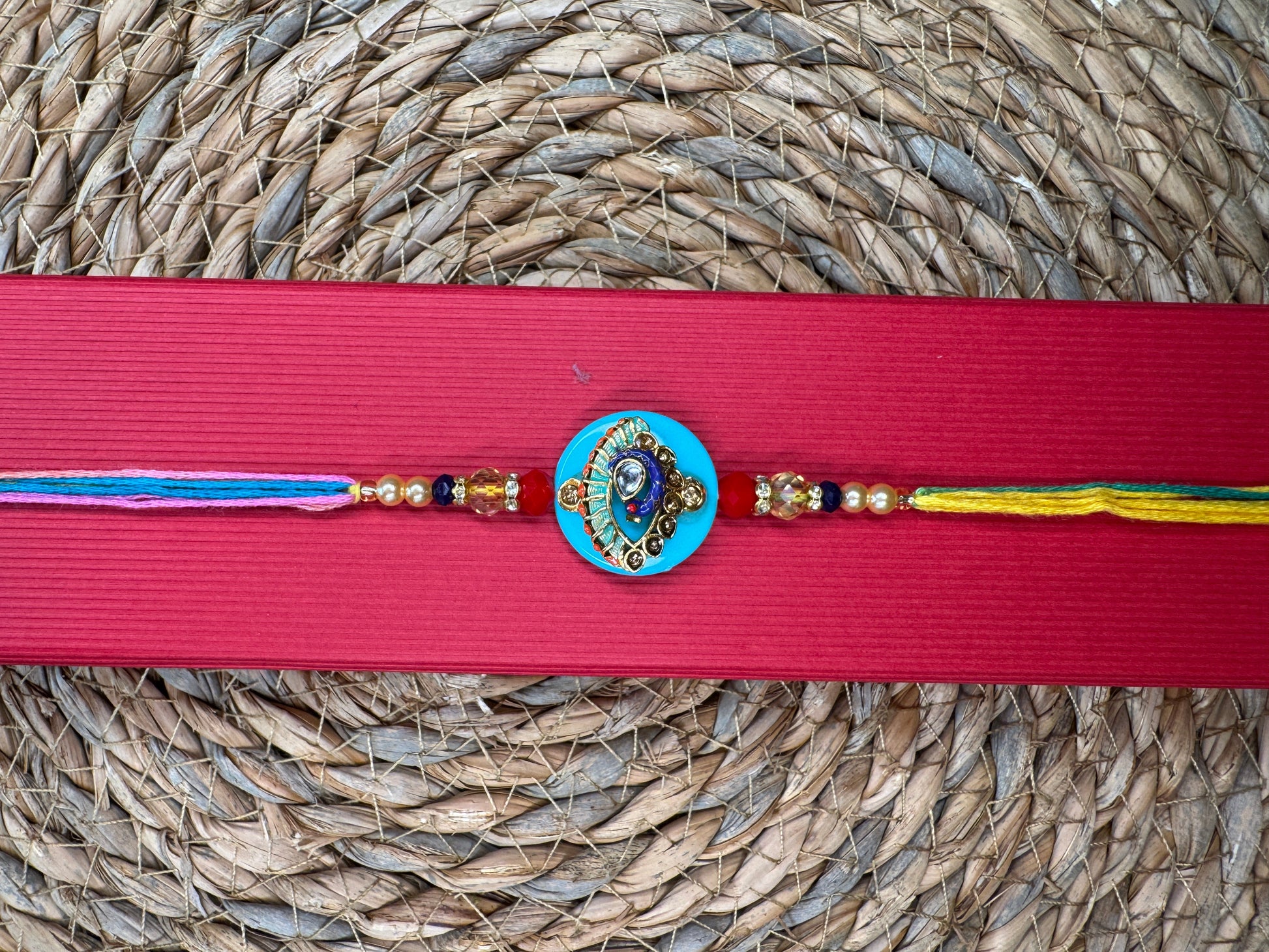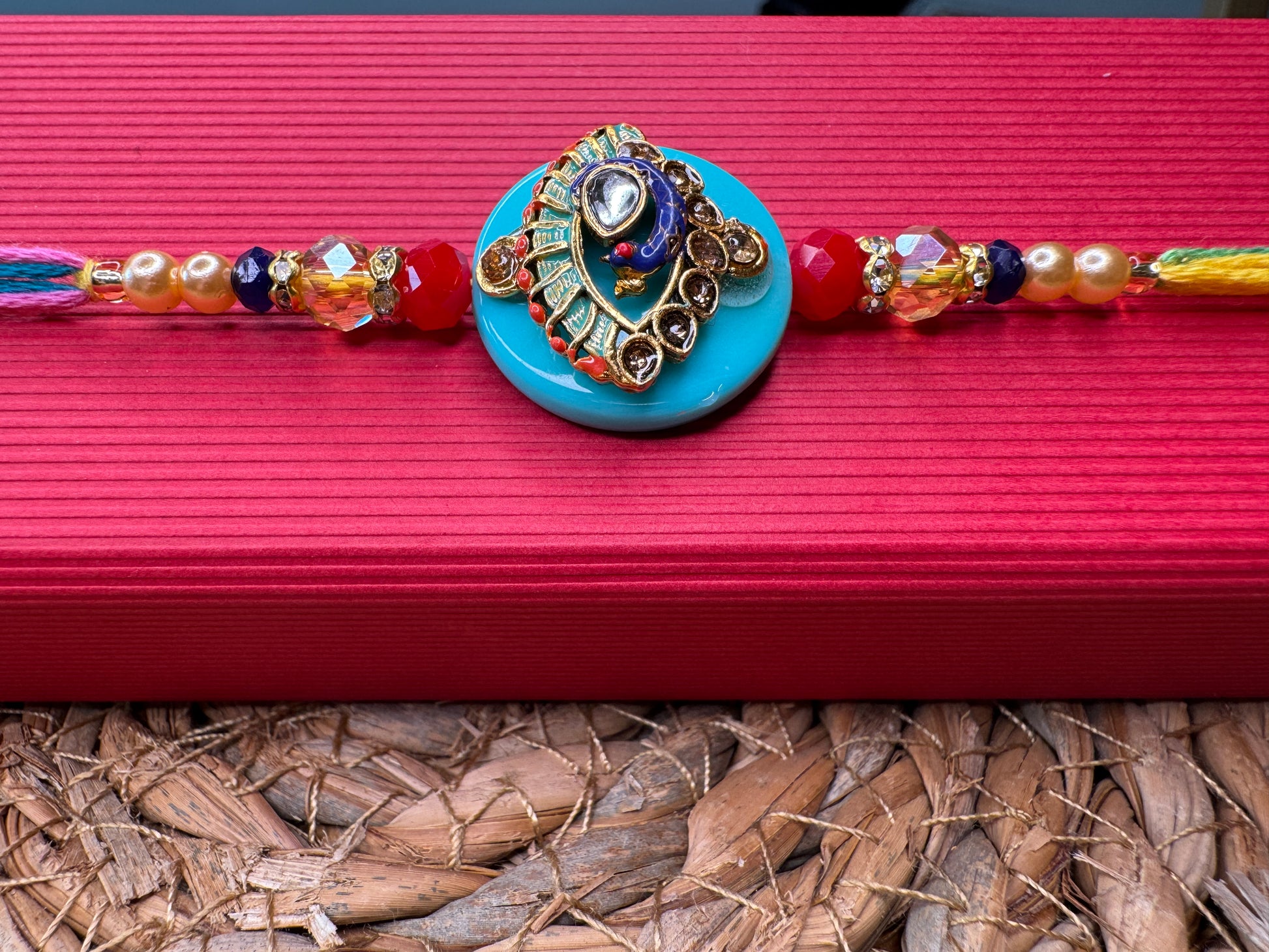 Celebrate the sacred bond of love and protection with unmatched elegance through our Premium Designer Rakhi. Crafted with intricate detail, sparkling stones, kundan embellishments, and rich traditional threads, this rakhi exudes sophistication and tradition.